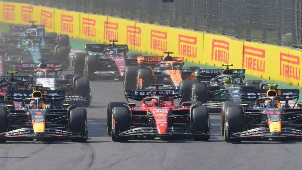 แต่คนที่ได้ดูในวันนั้นหลายคนคงจะคิดว่ามันเป็นการเสี่ยงโดยที่ไม่จำเป็น โดยหลังจากสัญญาณไฟแดงดับลง และรถทุกคันต่างออกสตาร์ทชิงจังหวะและพื้นที่เพื่อขึ้นหน้า Charles Leclerc และ Carlos Sainz คู่หูจากทีม Ferrari ที่ได้ออกสตาร์ทแถวหน้าในอันดับ 1 และ 2 ต่างก็ทำได้ไม่ดีนัก Charles Leclerc ออกตัวได้ช้ากว่าเท่าที่ควร ส่วน Carlos Sainz ก็ทำได้ไม่ดีเช่นกัน ทำให้ Max Verstappen ที่ออกสตาร์ทในอันดับ 3 และ Sergio Perez ที่ออกสตาร์ทในอันดับ 5 สามารถขึ้นมาประกบรถของ Charles Leclerc ทั้งสองด้านเหมือนเป็นแซนวิชที่มี Ferrari อยู่ตรงกลาง โดยที่ Max Verstappen นั้นได้เปรียบกว่าเพราะอยู่ด้านในก่อนที่จะเข้าโค้งที่ 1 ซึ่งเป็นโค้งหักศอกขวา